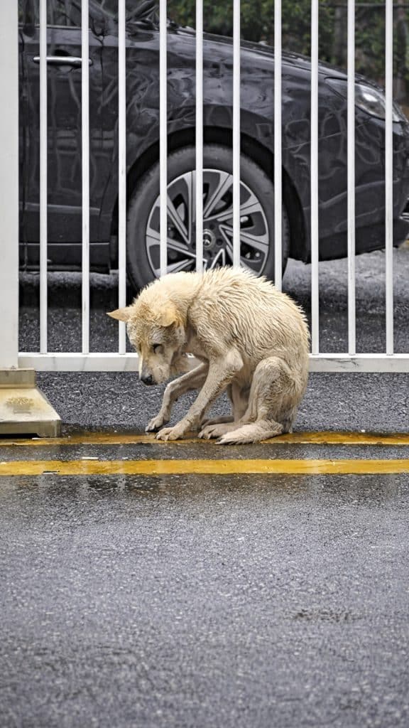 The weather offered no comfort. As the sky darkened one afternoon, rain began to fall harder, chilling the air and soaking everything in sight. Lucky pressed himself against a nearby fence, curling inward as if trying to disappear into himself. His body trembled from the cold, but even then, his gaze returned to the road again and again. Each passing car seemed to stir a fragile expectation that help—or a familiar face—might finally appear.