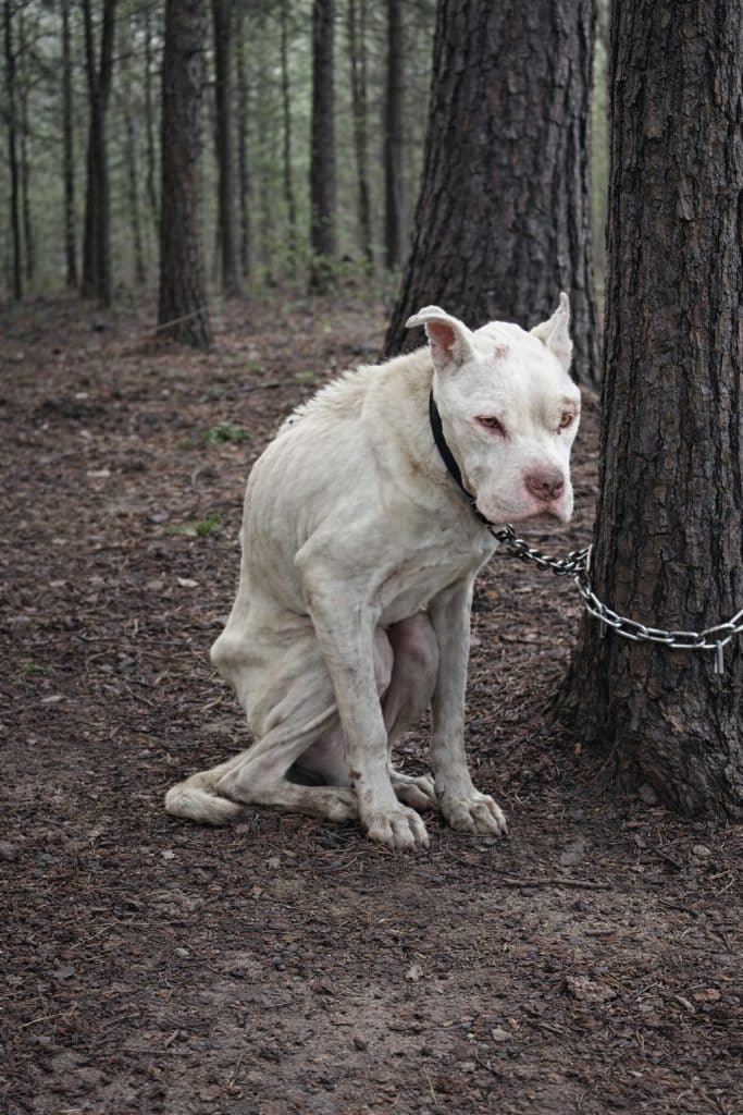It was an ordinary afternoon that would turn into something unforgettable. A man was walking through a quiet, wooded area when he noticed something unusual near a large oak tree. At first, he thought it was just debris or an old piece of equipment left behind. But as he stepped closer, his heart sank. Sitting beneath the tree was a pit bull, chained tightly to the trunk, barely moving.