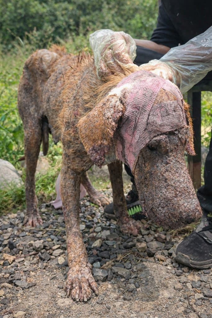 When the rescue team first came across the dog, it was immediately clear that this gentle soul had endured a long season of neglect and hardship. His body told a silent story—one of discomfort, exposure, and survival against the odds. Large areas of his skin were irritated and bare, and his overall condition reflected weeks, if not months, without proper care. He moved cautiously, as if every step required effort, yet there was something in his eyes that stopped the rescuers in their tracks. Beneath the visible suffering, there was still a quiet will to live.