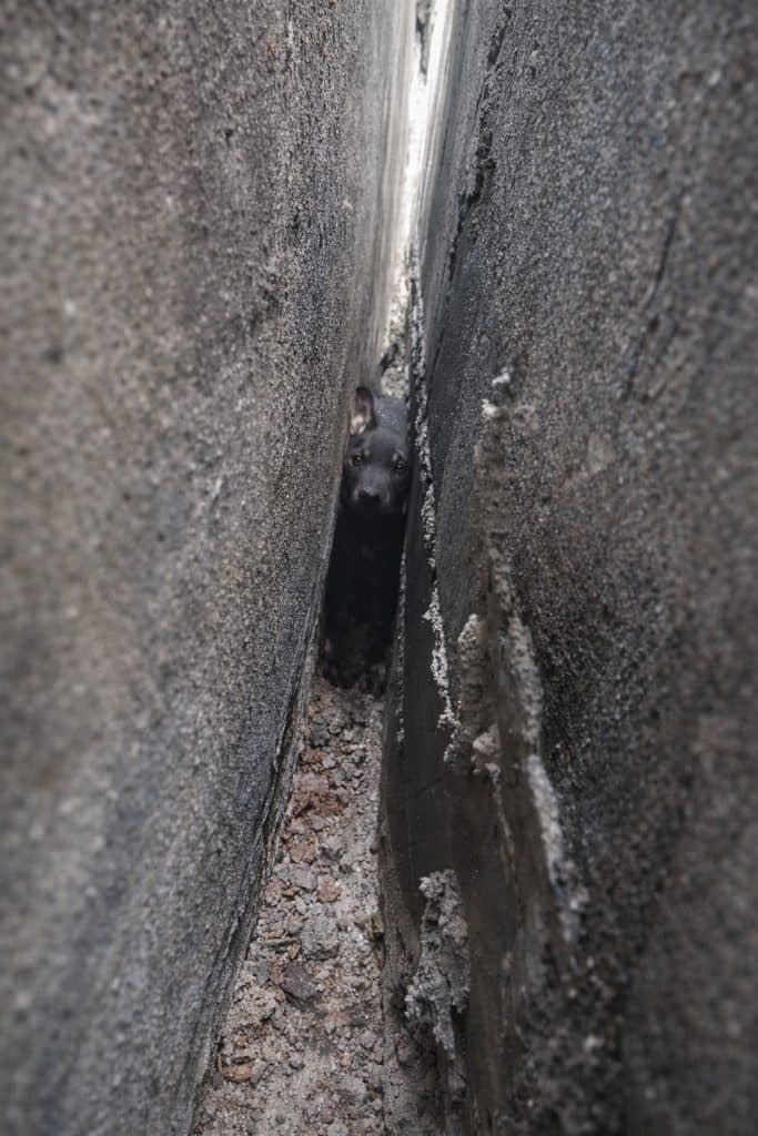Fortunately, compassion arrived when it mattered most. A passerby noticed the faint sounds coming from between the walls and stopped to investigate. Realizing that an animal was in trouble, they immediately contacted a local rescue team. When the rescuers arrived, they were met with a sight that stopped them in their tracks. Lucky’s small body was firmly wedged in the narrow gap, pressed tightly on all sides. He couldn’t move forward or backward, and every attempt to shift only increased his panic.