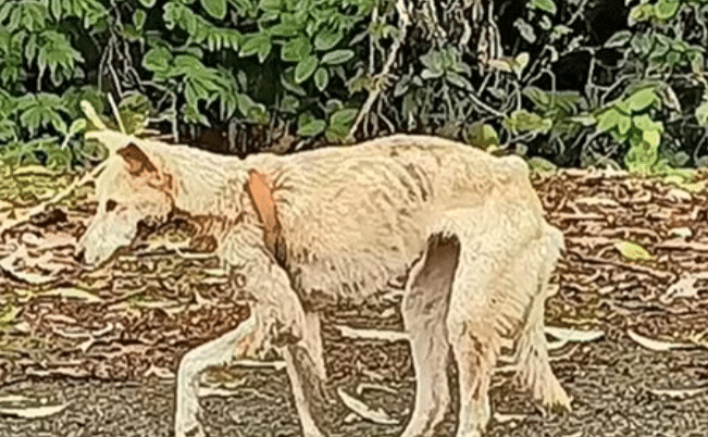 His fragile body told the story clearly. He was dangerously thin. His coat was dull and neglected. Old wounds marked his skin. And his front leg—crushed in a violent accident—hung useless and swollen. Any attempt to move sent sharp pain through his body, so he stayed still, conserving what little strength remained.