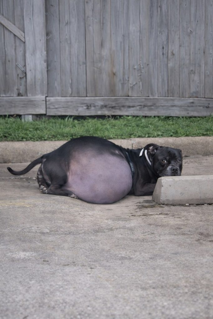 Her small body trembled, weighed down by something far heavier than exhaustion alone. Her belly was swollen far beyond what her fragile frame could support, and every breath she took felt labored, as if her body were asking for help it no longer knew how to call for. To most people passing by, she was just another stray—easy to overlook in a place that never slows down.