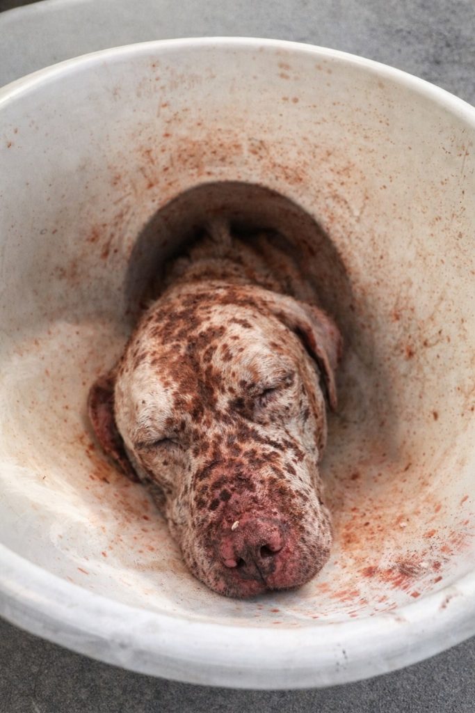 Under dedicated care, Stinger’s skin was gently treated, the infections addressed one step at a time. Tests revealed additional challenges, including a severe skin condition that explained much of his pain. He was also malnourished and weak, making every step of recovery delicate. Still, through it all, Stinger remained calm—quietly enduring, quietly trusting.