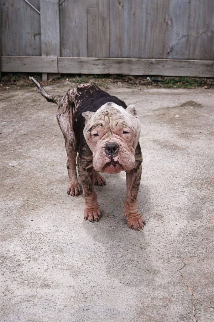 He was still very young, but his body showed signs of long-term neglect. Much of his fur was gone, leaving his skin raw and irritated from severe mite infestations. Painful sores covered parts of his body. His legs were weak, barely able to support him. Dehydration and malnutrition had drained his strength, and every breath came with effort.