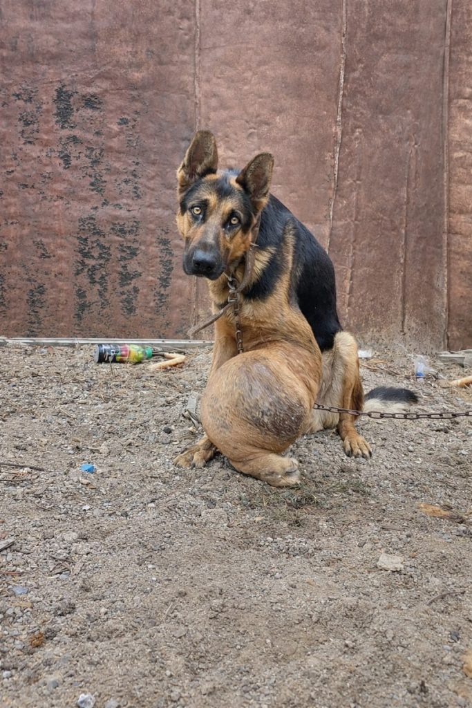 At the edge of a yard no one seemed to care about, he was tied to a short, rusted chain that defined the limits of his world. A few steps in each direction. Bare dirt beneath his paws. Broken glass and trash scattered nearby. Days passed without voices meant for him, without touch, without comfort. Food came irregularly—stale bread, leftover bones—just enough to keep him alive, never enough to make him well.
