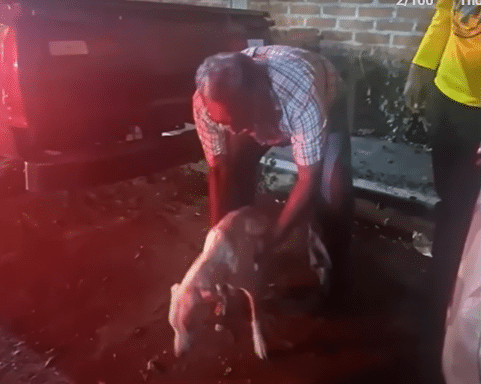 She contacted Dame Pata, a local rescue organization, and asked for help. The team responded immediately. They searched the market until they found Valencia hiding beneath a parked car, trembling but alert. When they reached for him, he managed a small tail wag—a quiet sign of trust in the people who had come back for him.