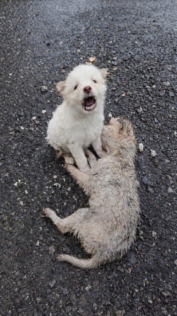 It happened on a quiet stretch of road, the kind most people pass without noticing. But that day, something stopped time. A small stray puppy stood motionless beside another dog lying on the ground, as if leaving simply wasn’t an option. There was no leash, no collar, no sign of an owner—only loyalty, raw and unspoken, holding the puppy in place.