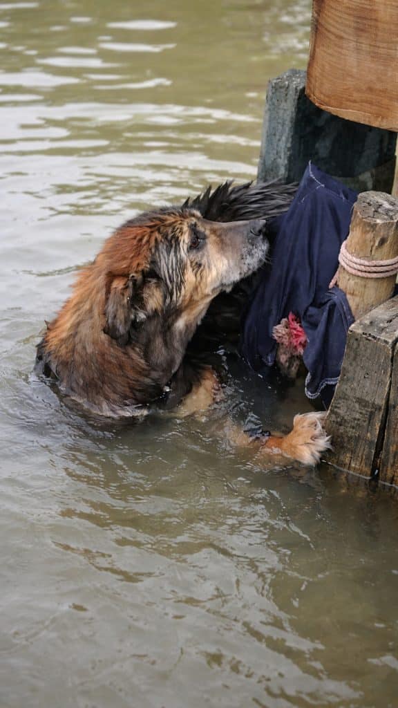 For nearly an hour, the dog struggled in the rushing river.