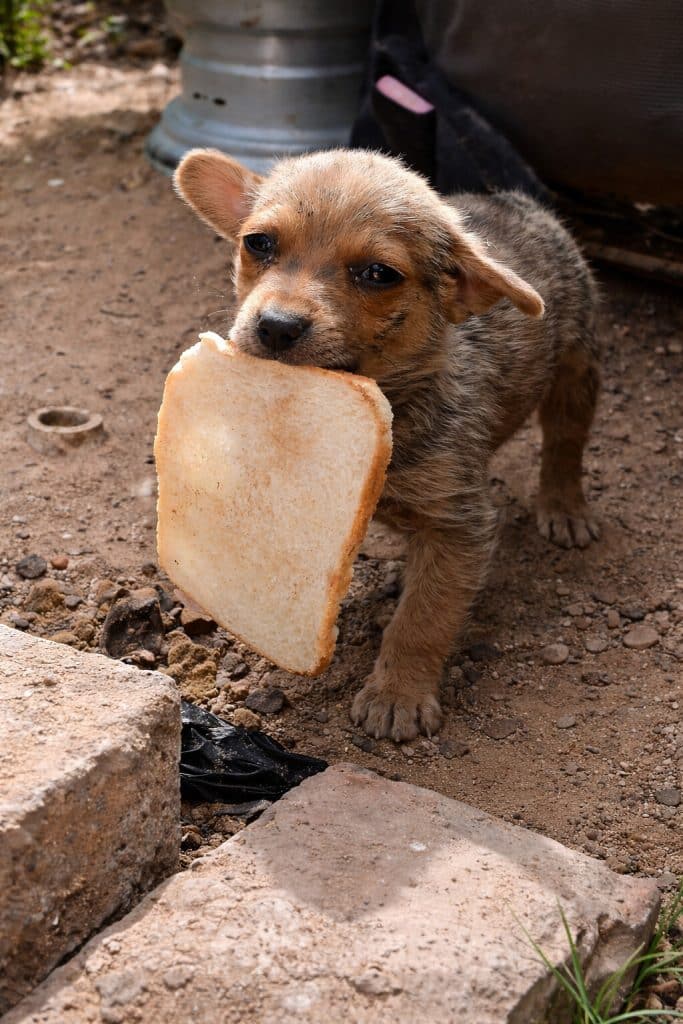 No one knew how he ended up there. There was no mother nearby, no littermates, and no sign that help was coming. He may have wandered too far or been left behind, but at his size, survival on the street was nearly impossible. The piece of bread he clung to wasn’t just food—it was a lifeline, proof that despite everything, this tiny puppy was still fighting to live.