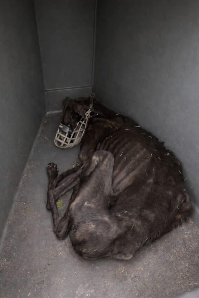 From the time he was very young, Coco’s world was painfully small. Confined inside a narrow cage, he grew up without space to move or warmth to comfort him. Days passed in silence, nights in hunger. Over time, the strength that defines a Greyhound slowly disappeared. His body weakened, his muscles faded, and survival became his only focus.