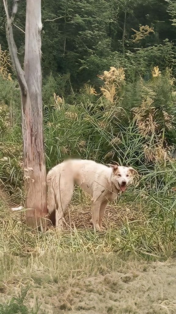 Freeing him took only seconds, but the relief was immediate. As the rope loosened, his body slowly sank to the ground—not in defeat, but from exhaustion. His tongue was dry, his coat coated in dust, and his movements were careful and slow. No one knew how long he had waited. What mattered was that he didn’t have to wait anymore.