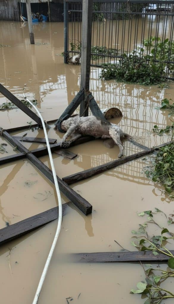 As floodwater rose, Buster’s fur grew heavy, dragging his body lower with every movement. Debris floated past—branches, boards, pieces of shattered homes. At first, he barked, hoping someone would hear him. When no one came, the sounds faded into labored breathing as exhaustion set in. What once symbolized safety—the leash—became an anchor pulling him down.