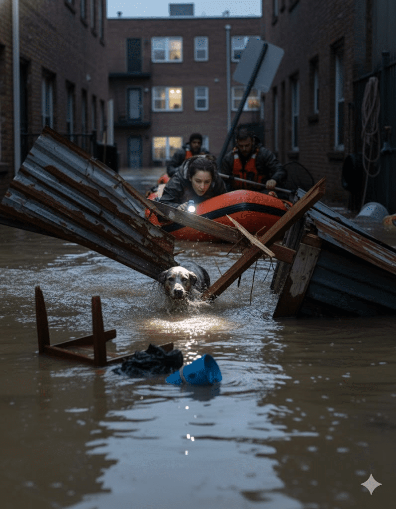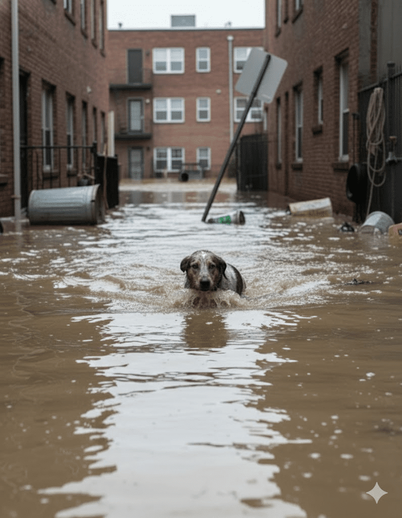 The flood arrived without warning. Streets that once felt familiar slowly vanished beneath muddy water, transforming Harbor City into a place no one recognized. Homes turned into dark outlines, and everyday sounds were replaced by the low rush of current. For people, it meant hurried evacuations. For animals, it meant being left behind with nowhere to go.