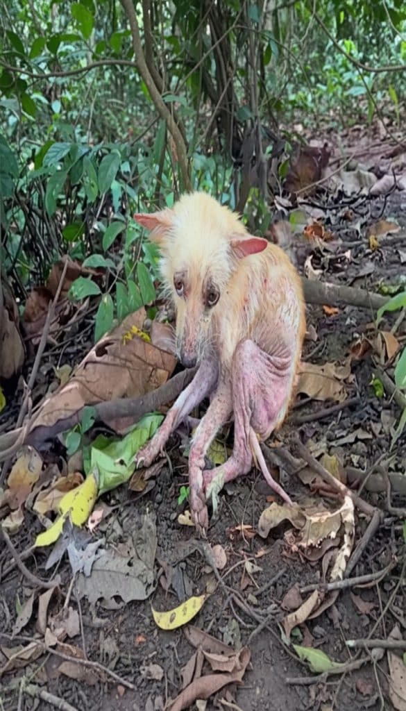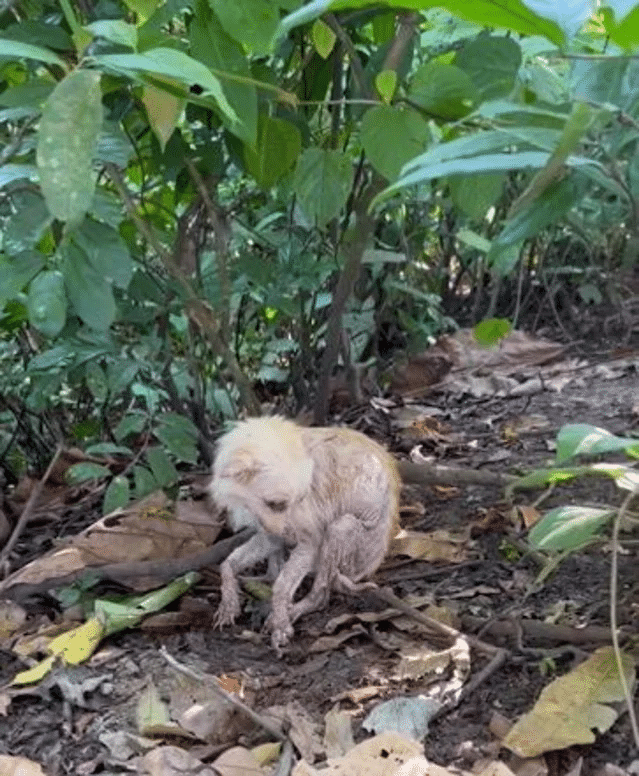 Hidden deep in the woods, a small female dog lay curled beneath fallen leaves, too weak to stand and too frightened to move. Her body trembled with exhaustion, her eyes wide with fear. It was clear she had been there for a long time—cold, hungry, and slowly fading into the background of a world that had already forgotten her.