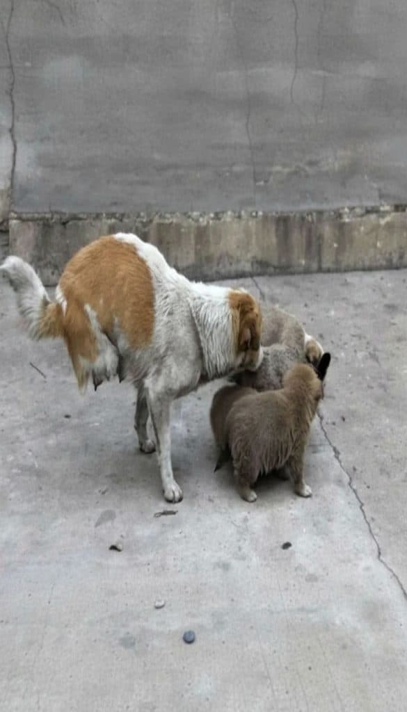 Then something happened that no one anticipated. Shi Bao became a mother. Against all expectations, she gave birth to a healthy litter of puppies. The news spread quietly, carried by surprise and admiration rather than shock. Here was a dog who had already endured so much, now welcoming new life with calm focus and care.