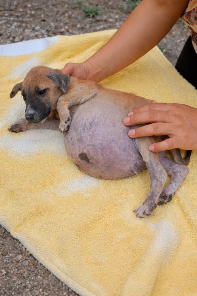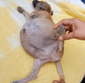 What stood out immediately was his swollen belly. It was round and tight, far too large for such a young puppy, making even small movements uncomfortable. He barely reacted when gently lifted, conserving what little strength he had left. The team knew instantly this was not something that could wait.