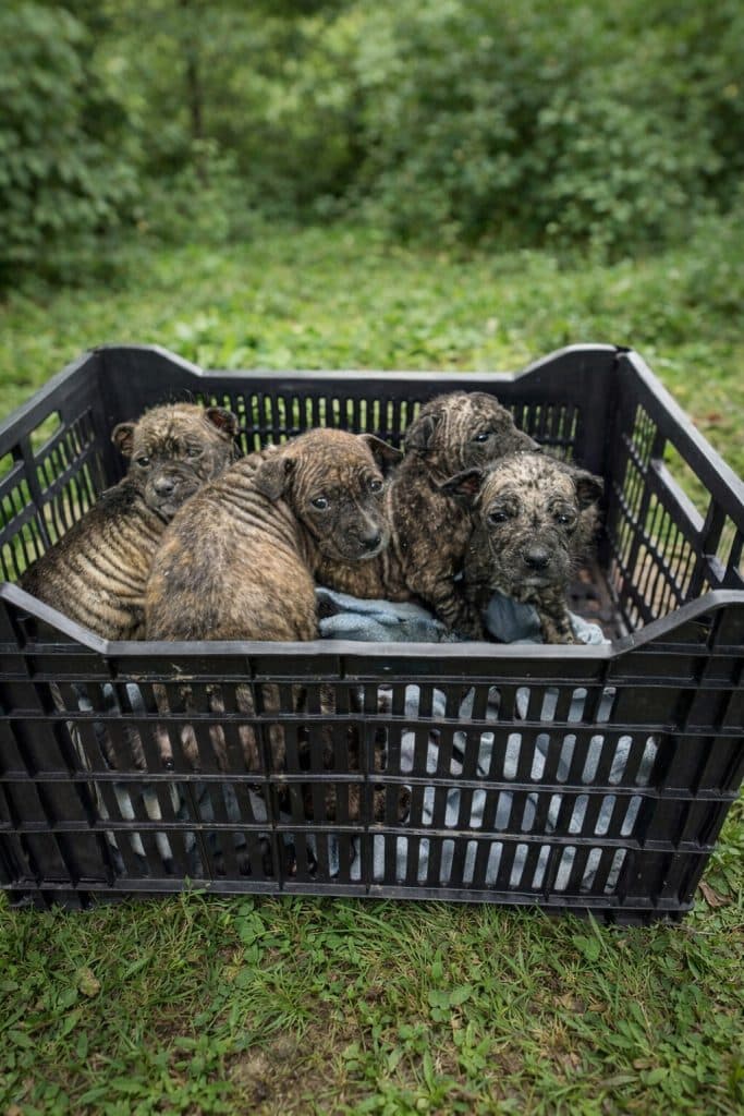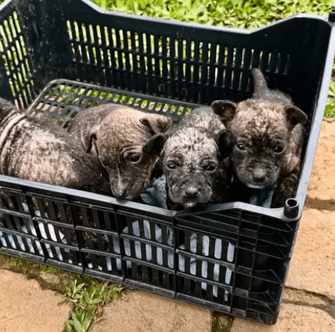 Inside were four newborn puppies, pressed tightly together, their tiny bodies trembling as they shared what little warmth they could create. Their eyes were barely open. Their stomachs were empty. There was no mother nearby. No shelter. No way for them to understand why they had been left behind.