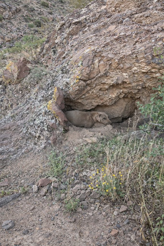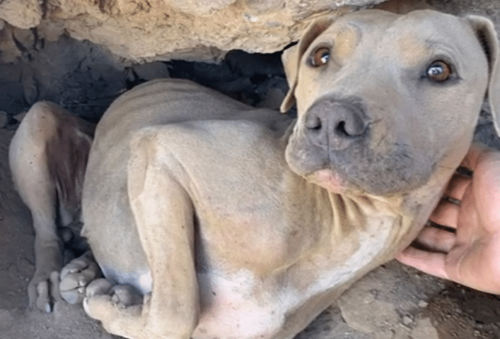 Tucked tightly into the rocks was a dog whose dusty coat blended so perfectly with the mountain that she was almost invisible. Only her eyes gave her away. They held exhaustion, fear, and a fragile kind of hope all at once.