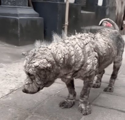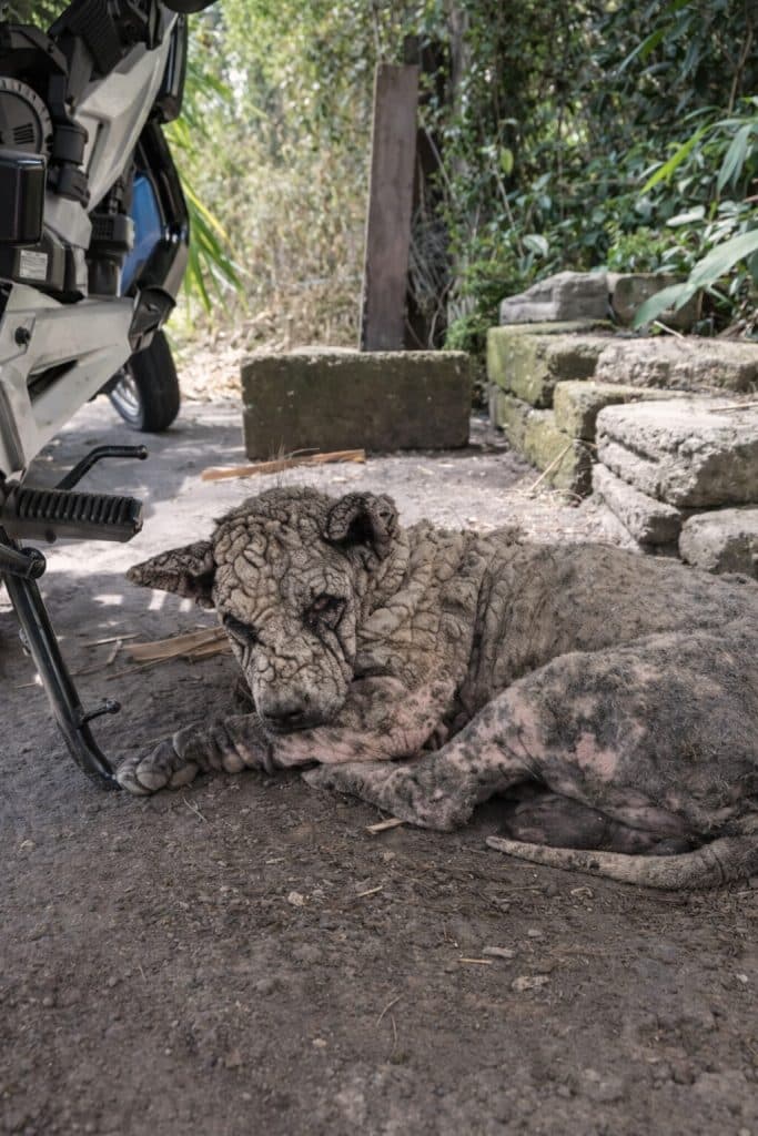 When Poleng was first found, his body barely resembled that of a dog. Thick, hardened layers of mange covered his skin, cracked and rough like dried cement. Every movement looked painful. Every breath seemed heavy. He had been abandoned by his owner, left behind simply because treatment would cost too much.