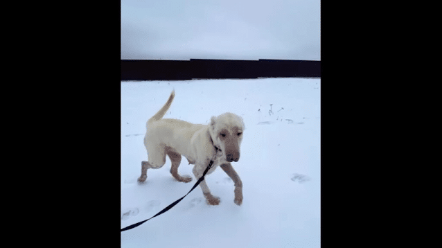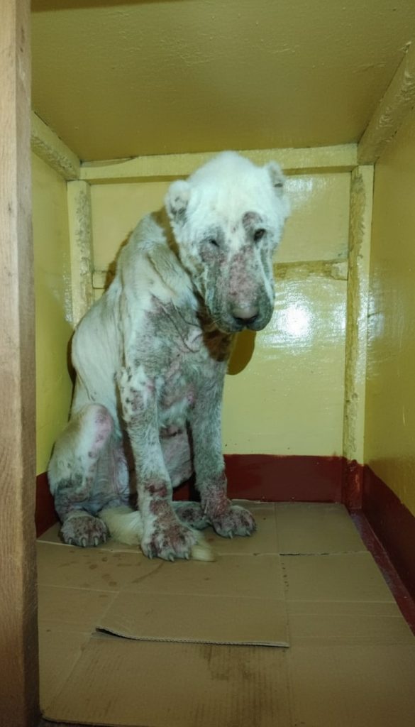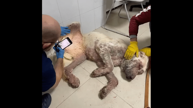 Up close, her condition told a clearer story. Grace was dangerously thin, her ribs visible beneath a patchy, neglected coat. Areas of missing fur exposed irritated skin that had gone untreated for far too long. Dirt clung to her body, and her movements were stiff and cautious.