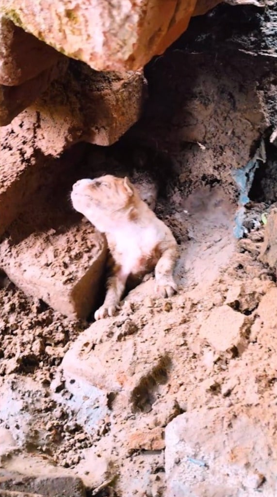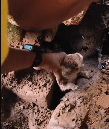 Mud, bricks, and heavy soil slid down at once, crushing the fragile space beneath it. The mother dog and several of her puppies managed to escape just in time. But one tiny puppy was not fast enough. He was buried deep beneath the rubble, trapped in darkness, cold, and wet earth.
