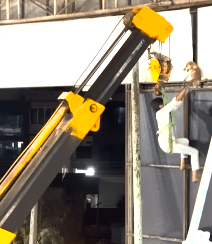 With time slipping away, the rescue team made a bold decision. A heavy-duty crane would be used. One young rescuer volunteered to be lifted by the crane’s hook, secured only by a safety harness. As the machine rose, he was suspended in open air, slowly moving toward the frightened dog from outside the building.