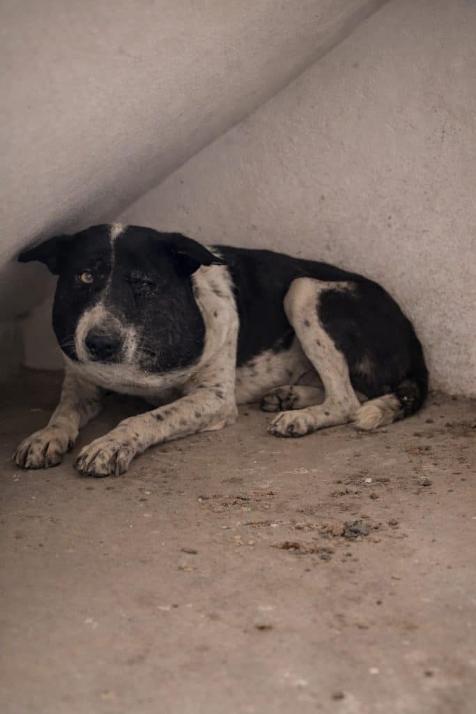 When rescuers arrived, they found him curled beneath a dark stairwell, exhausted and clearly in distress. His eyes reflected fatigue and discomfort, the kind that comes from suffering in silence for far too long. The swelling around his neck was impossible to ignore, and it was clear that every breath was a challenge.