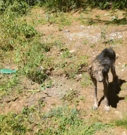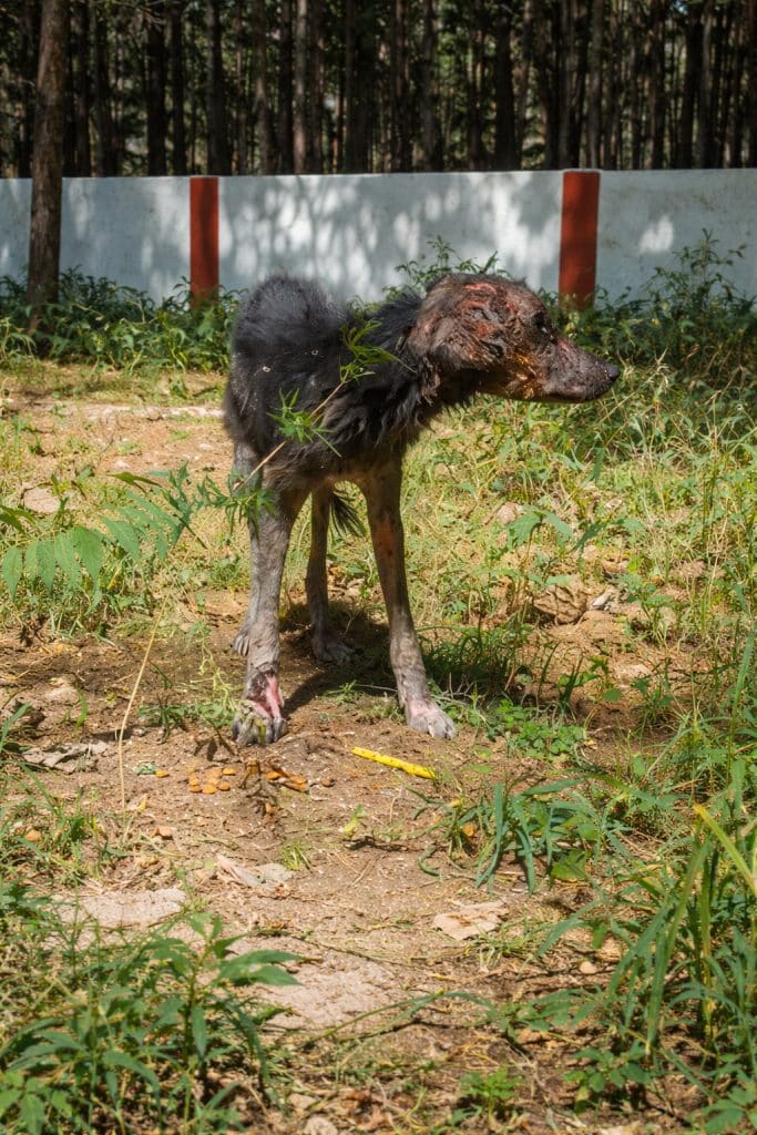 When Skully was first seen, it was difficult to believe he was still alive. His body was painfully thin, each rib clearly visible beneath damaged skin. He lay near the roadside, barely moving, his strength nearly gone. His eyes carried a deep exhaustion, the kind that comes from prolonged suffering and isolation.
