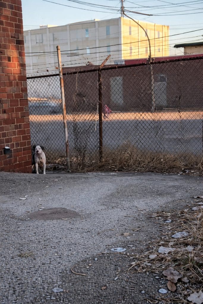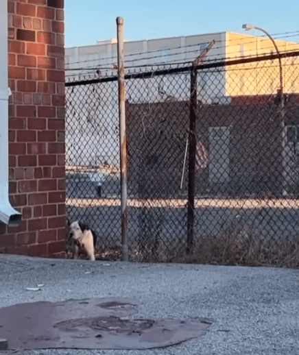 Tucked into a narrow space between a metal fence and a brick wall, a white-and-black pit bull was found hiding in silence. Her body was thin, her posture low, and her entire frame trembled with fear. The space offered little comfort, yet it was the only place where she felt hidden from a world she no longer trusted.