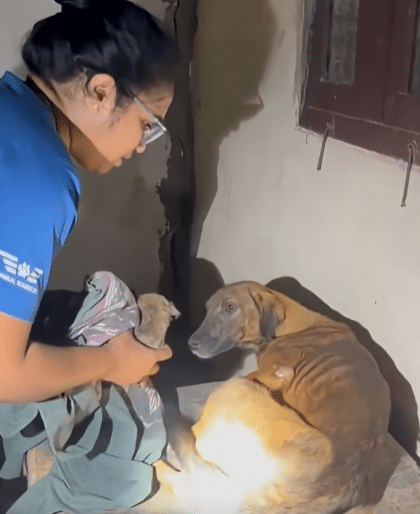 As soon as they reached the surface, the puppies were cleaned and checked. Despite their ordeal, they were breathing steadily. Their small bodies relaxed for the first time since falling into the darkness. Nearby, their mother watched every movement, pacing anxiously, never taking her eyes off them.