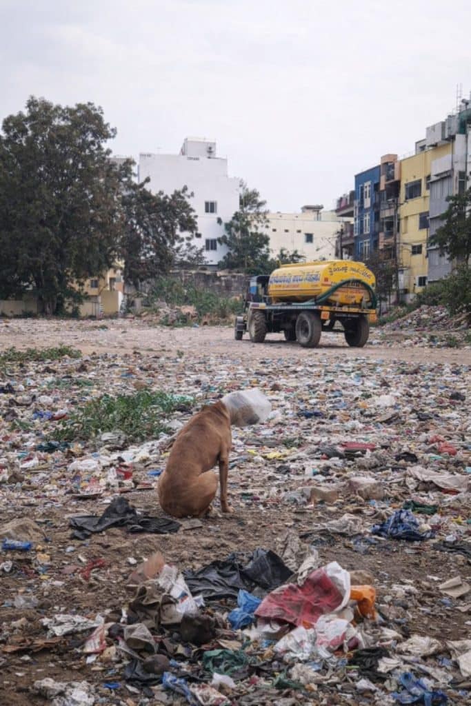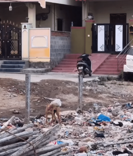 Not far away, the same rescue team encountered a second threat—this time involving plastic waste. A stray dog had become trapped with his head stuck inside a discarded plastic container at a trash-filled site. Terrified, the dog ran whenever anyone approached, making rescue difficult and risky.