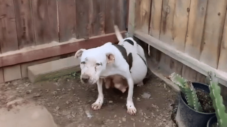 On a quiet afternoon in early autumn, a woman stepping into her backyard made a discovery that would change not just one life, but ten. Tucked into the far corner of her garden, beneath a patch of overgrown shrubs, lay a trembling pitbull. Her body was curled tightly as if trying to protect herself from the world. Her thin frame, nervous eyes, and swollen belly told a story long before she could ever be touched or comforted.