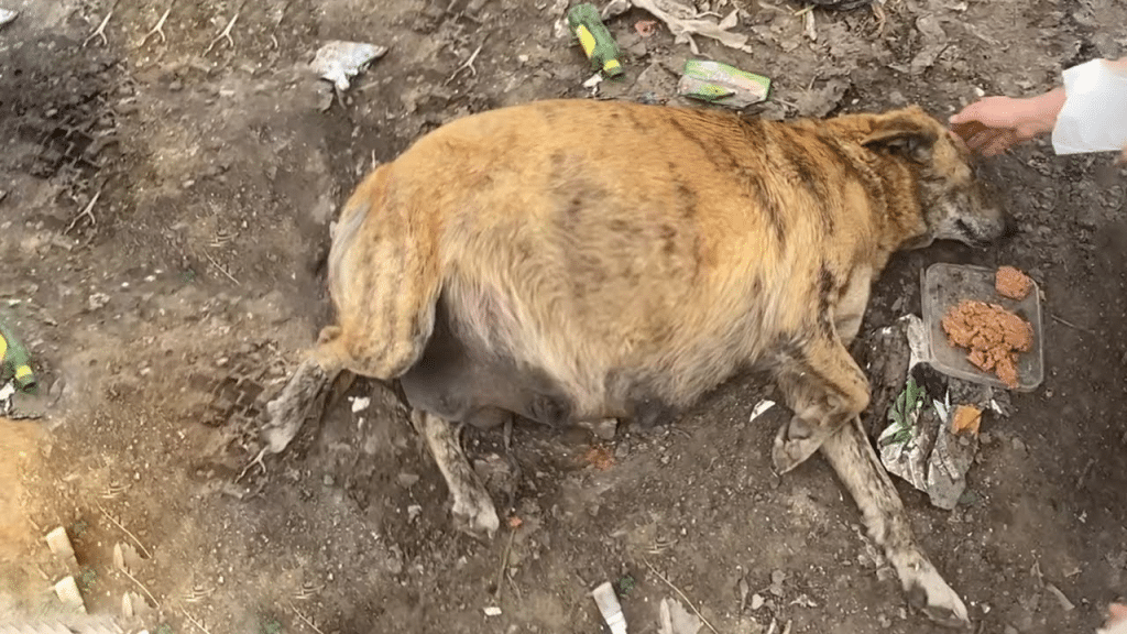 Her swollen belly revealed the lives she carried, while her trembling breath showed how close she was to losing the strength to keep going. Anyone who looked into her eyes could see the story she held—one of exhaustion, confusion, and quiet hope. Once, she must have known comfort. But now she lay abandoned, left behind at the very moment she needed kindness the most.