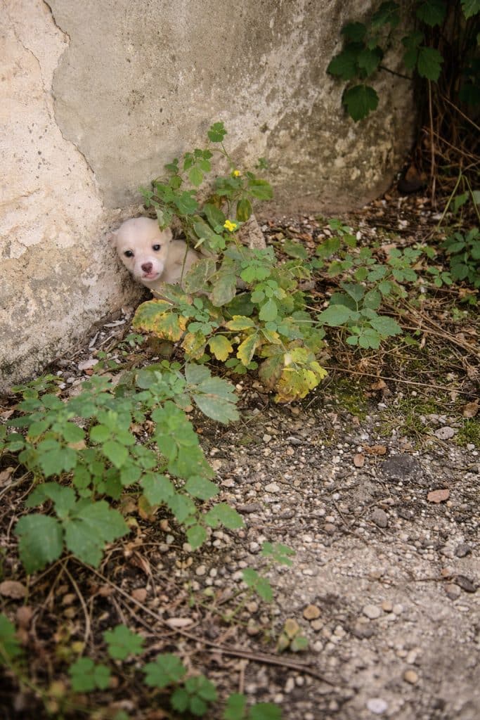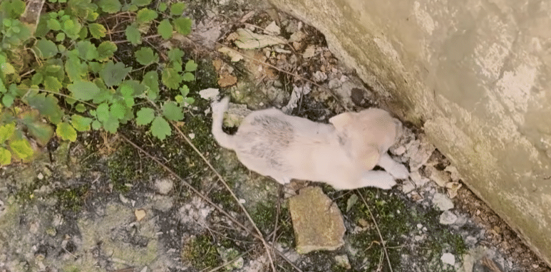 Under the harsh heat of nearly 39°C, the team searched through a crumbling, deserted building surrounded by trash and overgrown weeds. After carefully checking empty rooms and dense bushes, they finally spotted him—a tiny, pale-colored puppy curled tightly against a wall, almost blending into the debris. He was small, silent, and clearly terrified.