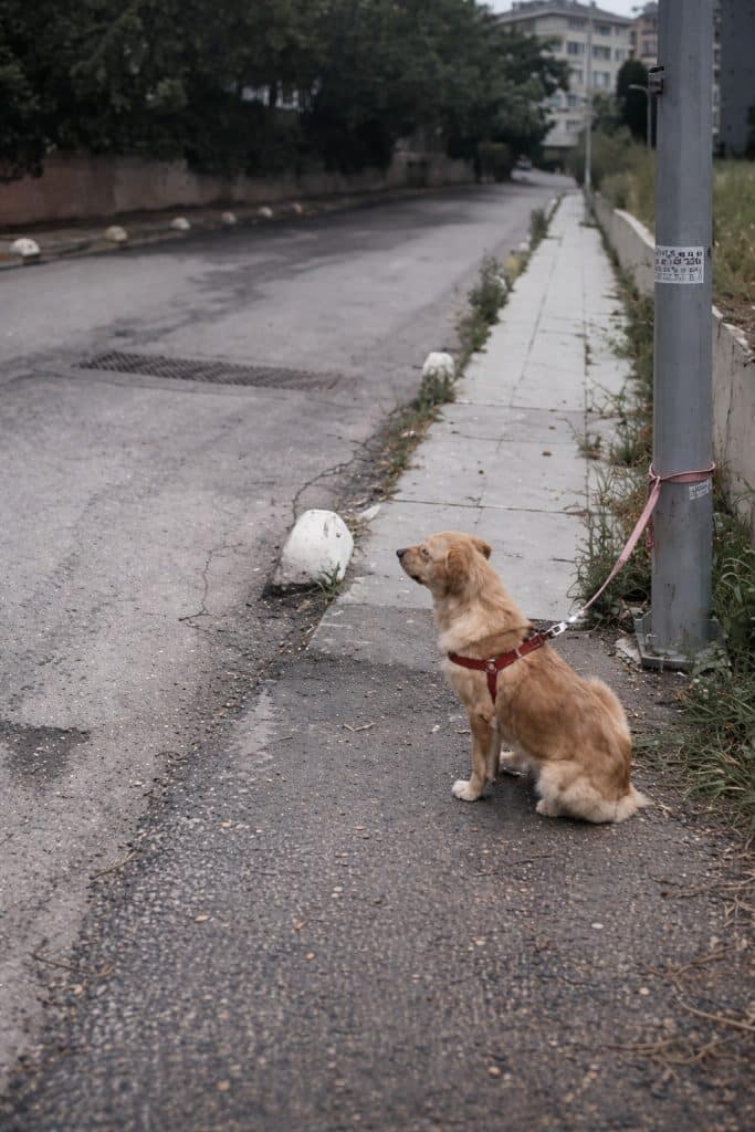 The dog didn’t panic. He didn’t bark or pull against the chain. Instead, he stayed exactly where he was, eyes fixed on the direction the car had disappeared. To him, this wasn’t abandonment. It was a pause. He waited patiently, convinced his person would return. Passersby noticed him. Some stopped briefly to pet him, offering quick comfort, then continued on their way. The dog remained, chained and hopeful.