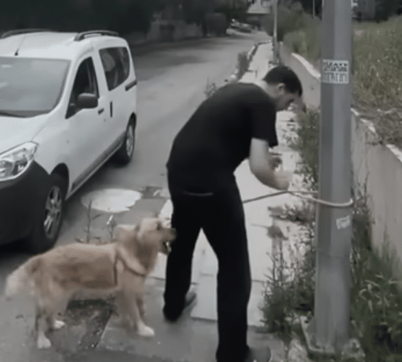 The story began quietly, captured by a roadside CCTV camera. A white car pulled over, blending into the normal rhythm of the street. A man stepped out, led a Golden Retriever out of the vehicle, and calmly tied him to a utility pole on the sidewalk. There was no hesitation. No backward glance. Moments later, the car drove away, leaving the dog standing there alone.