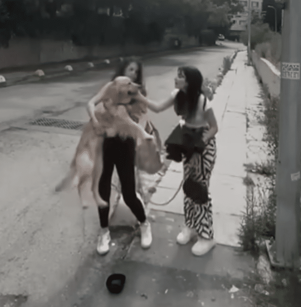 Eventually, a woman walking past noticed something that felt wrong. The dog was still there. Still chained. Still alone. She stopped, concern written across her face. When she approached, the dog responded immediately with gentle affection, pressing close as if silently asking for help. She sat beside him, speaking softly, offering reassurance he had been missing all afternoon.