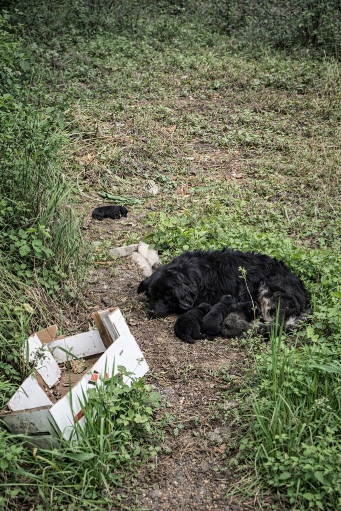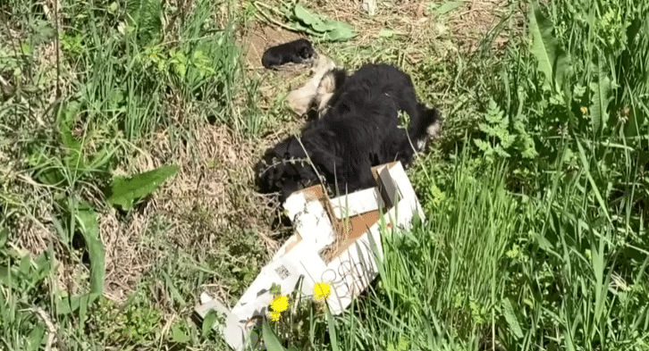 The rescue began beside a quiet roadside, where few people would stop long enough to notice what lay just beyond the grass. In a shallow roadside ditch, a black mother dog was found curled tightly around her newborn puppies. They were sheltering inside a worn cardboard box, damp and fragile, surrounded by tall weeds. The mother was thin, exhausted, clearly hungry and thirsty—but her body remained wrapped protectively around her babies.