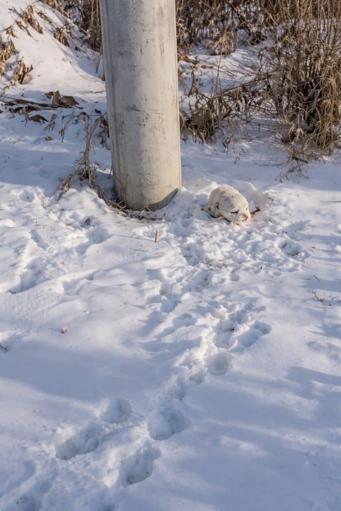 On a snowy winter day, while walking his dog through a quiet, frost-covered path, a young man heard a faint sound cutting through the cold air. At first, he wasn’t sure what it was. Then he saw it—a tiny white puppy lying alone in the snow, barely moving, its weak cries almost lost beneath the wind and falling flakes.