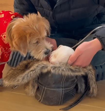 Knowing the puppy was far too young to eat solid food, the man went to the store and bought powdered goat’s milk. Using a syringe, he fed the puppy drop by drop, carefully and patiently. During this time, he noticed the tip of the puppy’s tail was injured, likely affected by the extreme cold. Even so, the puppy responded calmly, focusing only on warmth and comfort.