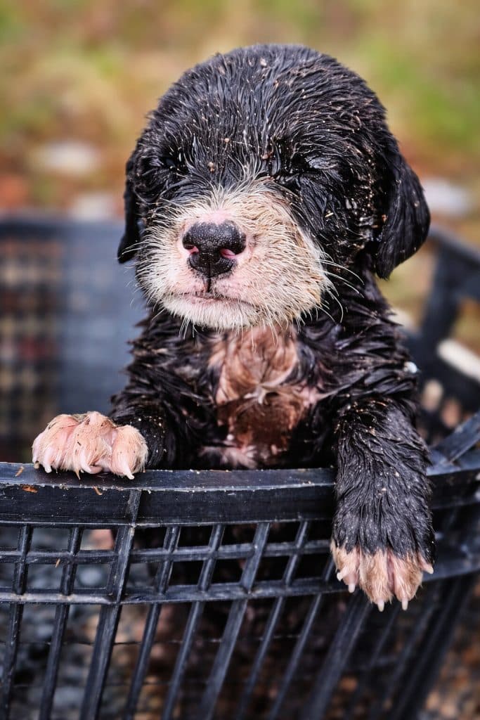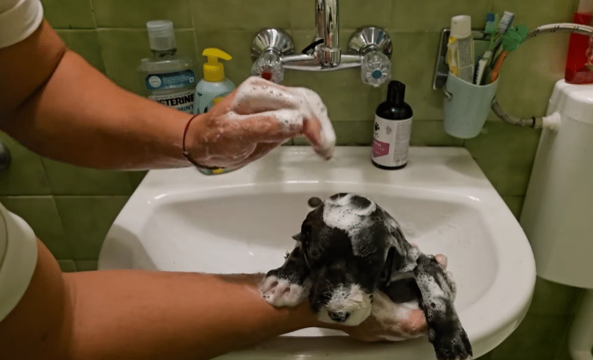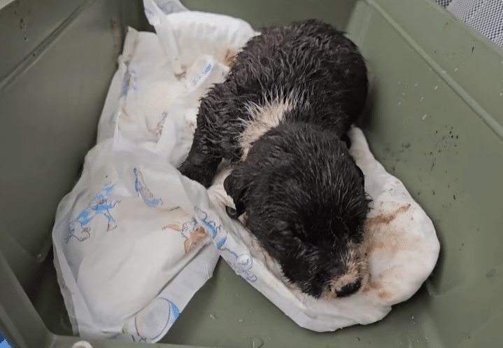 Not long after, heavy rain poured down, flooding the muddy hole that had been her only shelter. With nowhere to escape, the mother dog went into labor right there, surrounded by water and wet earth. Seeing the danger, the rescuer made a quick decision. The entire family was brought indoors to warmth, dryness, and safety.