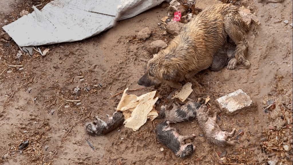 There, pressed into a patch of muddy ground, a young mother dog curled her body around her newborn puppies. Rain from the night before had soaked the earth, and her thin coat did little to shield her from the lingering chill. Yet even as her body trembled, she stayed perfectly still, determined to keep her babies warm. A worn piece of tarp fluttered beside them, the only barrier she had tried to use against the cold wind.