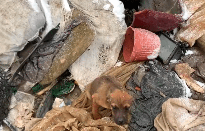 Between piles of discarded debris, they found her. A tiny brown puppy, curled tightly against the frozen ground, shaking uncontrollably. She was barely more than a shadow in the snow, her body stiff from the cold. Yet when she noticed movement, her tail moved — just slightly. It was a small gesture, but it said everything. She was still holding on.