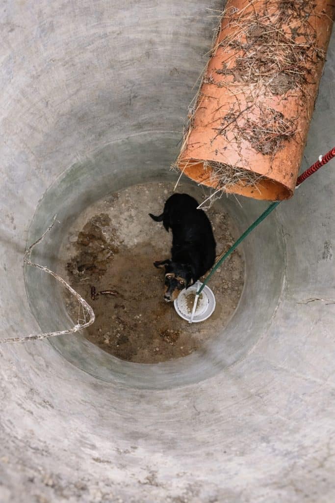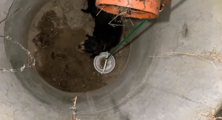 Knowing help would take time, Ivan did everything he could. Using a rope and a bucket, he carefully lowered food and water into the dark space below. The dog, weak but alert, responded. Those small acts helped keep him alive while Ivan contacted a rescue organization for urgent assistance.