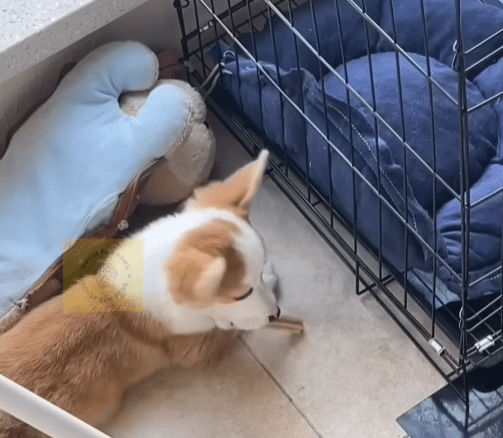 Late one evening, on a quiet city street, a young man noticed a small Corgi lying motionless near the roadside. The puppy was thin, weak, and clearly exhausted. He did not run or resist when approached. After being offered food, the little dog ate slowly, as if unsure when his next meal would come. Wanting to help, the young man brought him home, hoping rest and warmth would be enough.