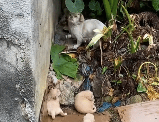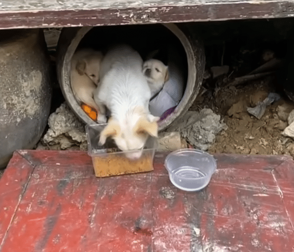 At around eight in the morning, a man passing by an abandoned house noticed movement inside. When he stepped closer, he discovered a mother dog and her three tiny puppies, barely three weeks old. The night’s heavy rain had left them soaked, cold, and visibly hungry. The space offered no real shelter, only damp floors and broken walls.