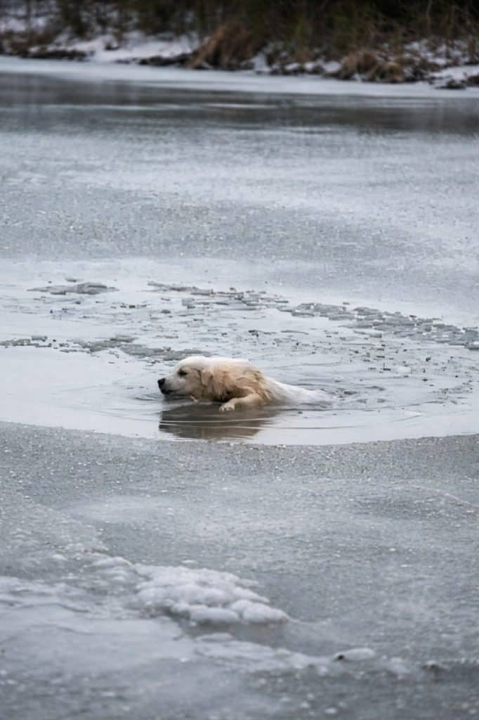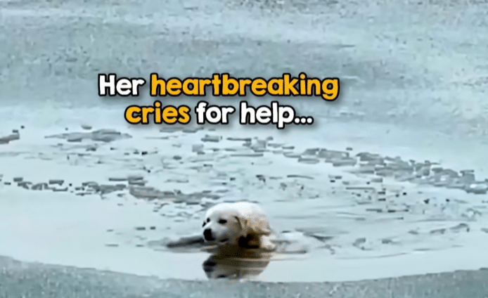 The video opens on a moment that feels painfully quiet and urgent at the same time. In the middle of an icy lake, a small puppy struggles to stay afloat, caught in a pocket of freezing water surrounded by solid ice. His body trembles uncontrollably, and each movement grows weaker than the last. His cries echo across the frozen surface, thin but desperate, as he fights to keep his head above the water.