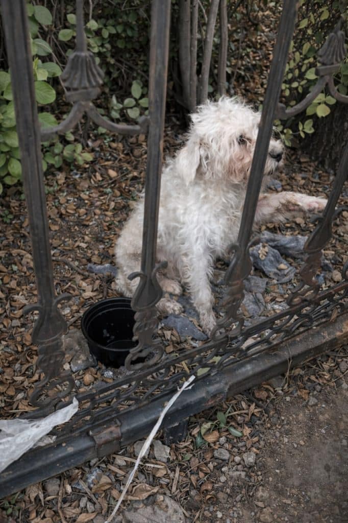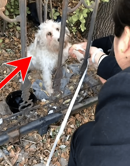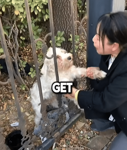 Behind the greenery stood a metal fence, and wedged tightly between its iron bars was a small white dog. His body was stuck at an unnatural angle, unable to move forward or backward. According to what they later shared, the dog appeared to have been trapped there for nearly two days. His posture was rigid, his energy gone, and his eyes reflected exhaustion rather than fear.