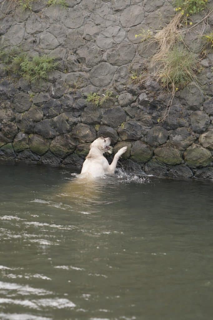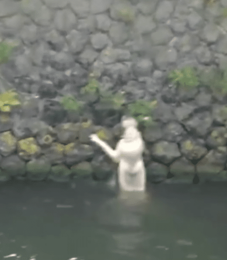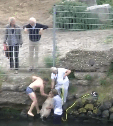 The video opens on a scene no one ever wants to witness. A white dog had fallen into a deep water area bordered by tall, steep stone walls. With no easy way out, the dog struggled desperately, trying again and again to claw onto the rocks. Each attempt ended the same way — slipping back into the cold water. His movements grew slower, his strength clearly fading.
