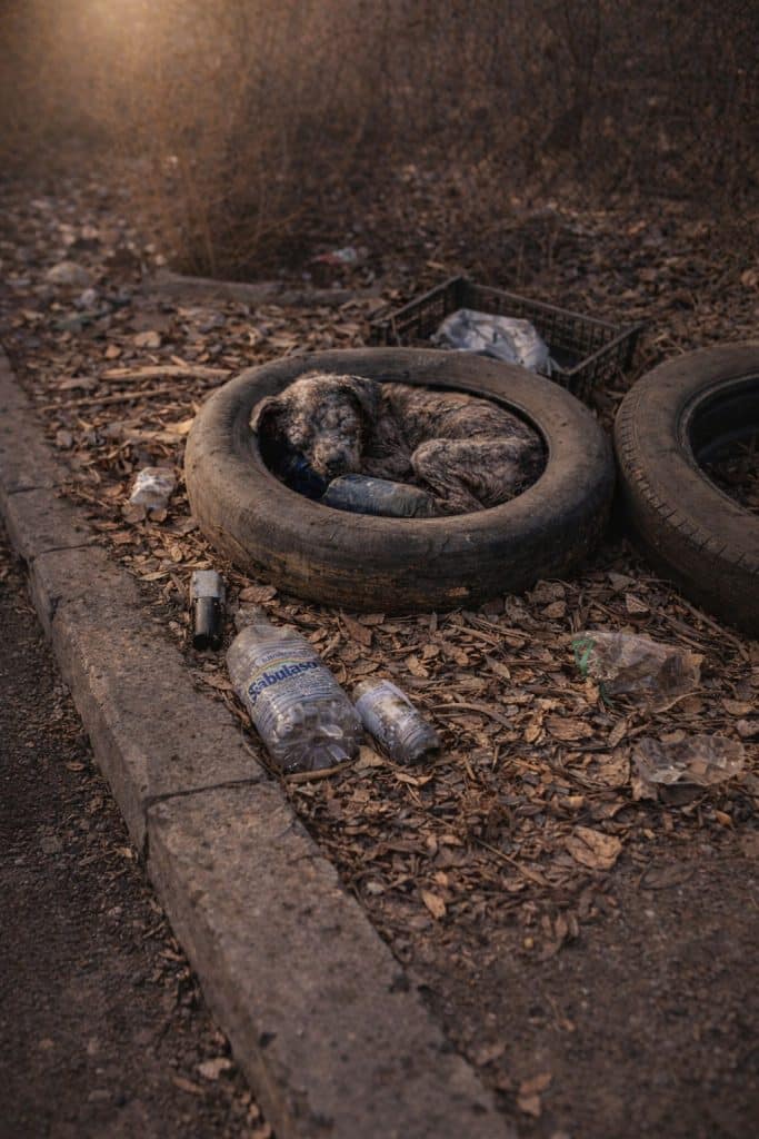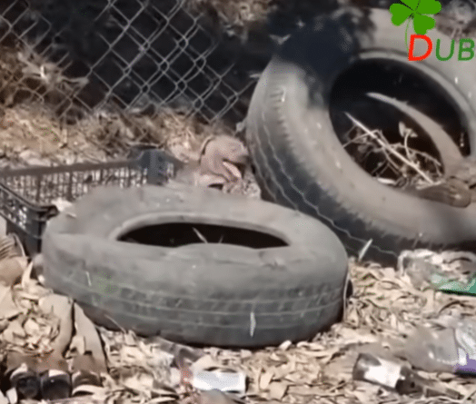 In a forgotten, desolate field, surrounded by debris and silence, volunteers from a local rescue organization discovered a sight that stopped them in their tracks. Curled tightly inside an old, discarded tire lay a female dog whose body bore the marks of long-term suffering. Her frame was painfully thin. Her skin was damaged and inflamed. That tire had become her shelter, her protection from cold nights, and her last defense against a world that had already turned away.